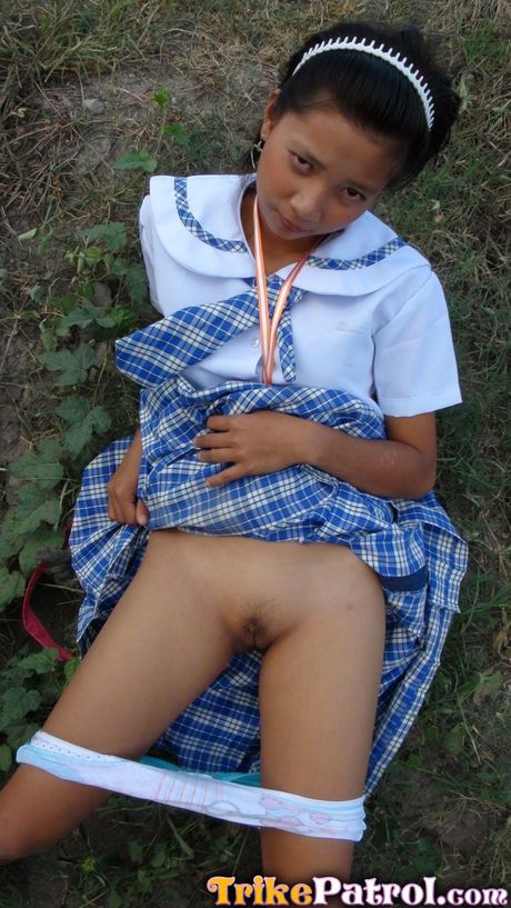 Trike Patrol: Asian schoolgirl Sally strips and shows her hairy pussy up close