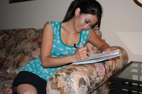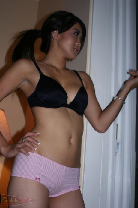 Matts Models: Asian teen Taya strips naked and toys her pussy with a dildo in the kitchen