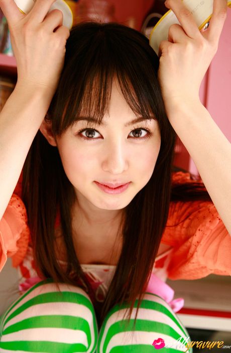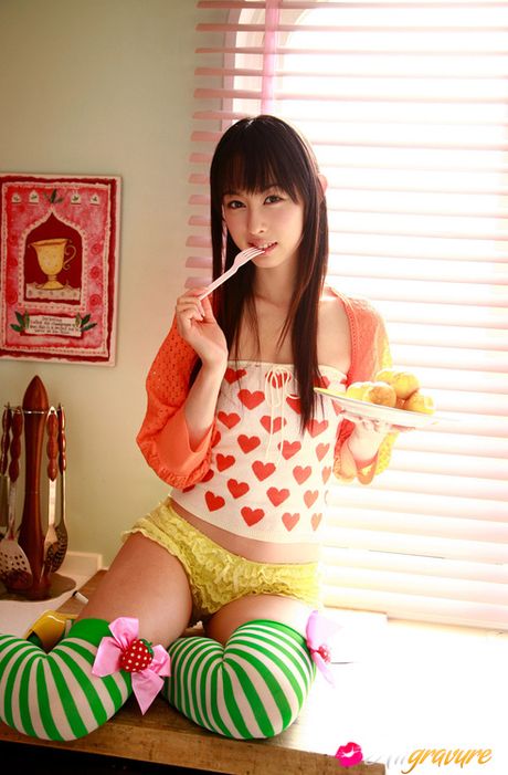 All Gravure: Rina Akiyama Asian in long colorful socks enjoys some sweets