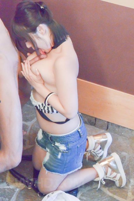 Jav HD: Wakaba Onoue in shorts sucks cock and rubs it of and with boobs